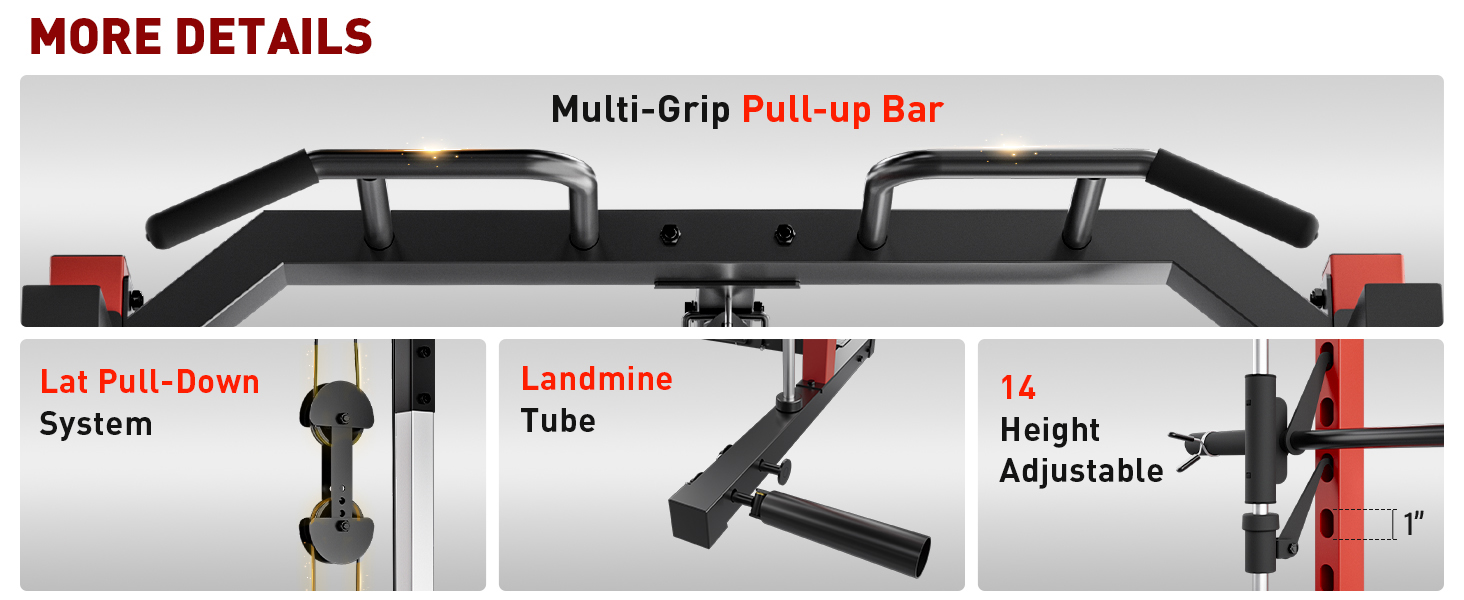 [Endless Training Possibilities with Versatile Choices] OPPSDECOR offers you 3 various type to meet your needs, adjustable smith machine, basic power cage, multi-function pro power rack with lat pulldown. Besides, each type has 2 colors for you to choose which help you build your perfect home gym.